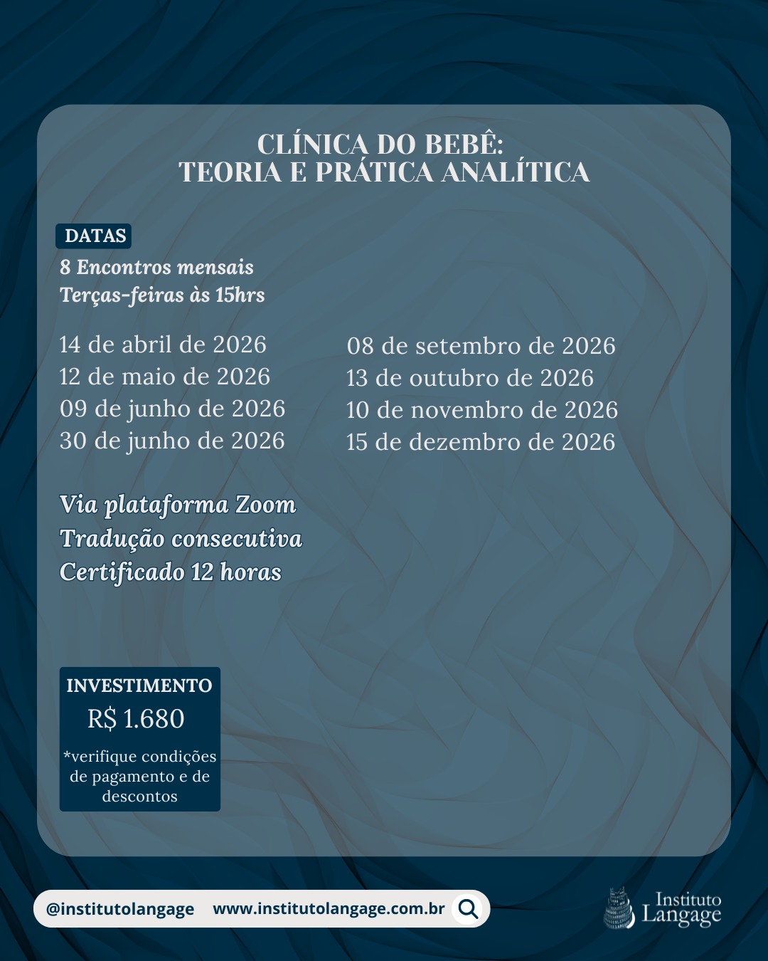 Possibilidade de parcelamento em até 5 VEZES. Desconto de 20% para membros da La Cause des Bébés, profissionais da rede pública e APAE, alunos de outros cursos do Instituto Langage, membros da especialização do Instituto Langage. Desconto de 40% para membros da Formação Permanente do Instituto Langage. Desconto de 50% para estudantes de graduação.