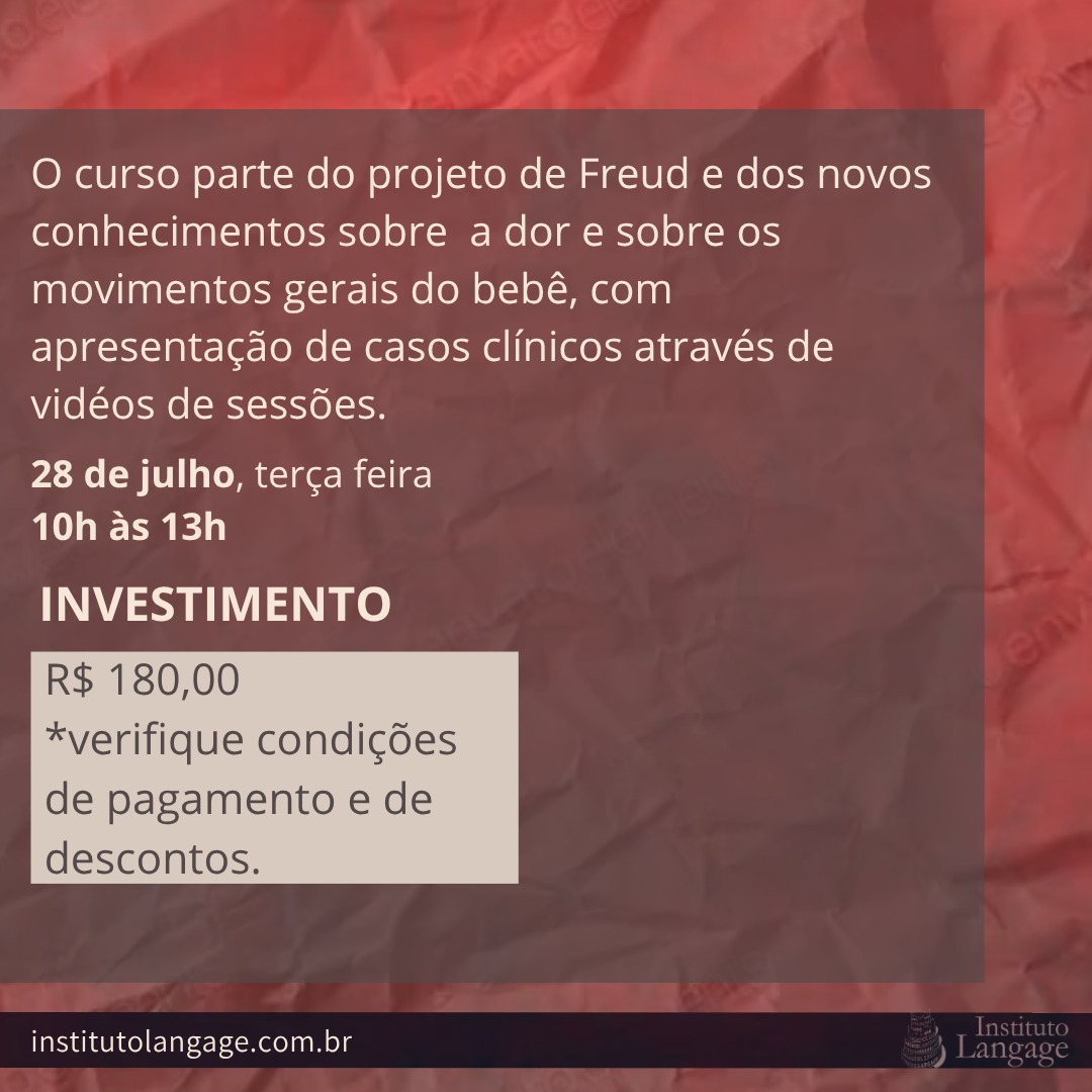 O curso parte do projeto de Freud e dos novos conhecimentos sobre a dor e sobre os movimentos gerais do bebê, com apresentação de casos clínicos através de videos de sessões.